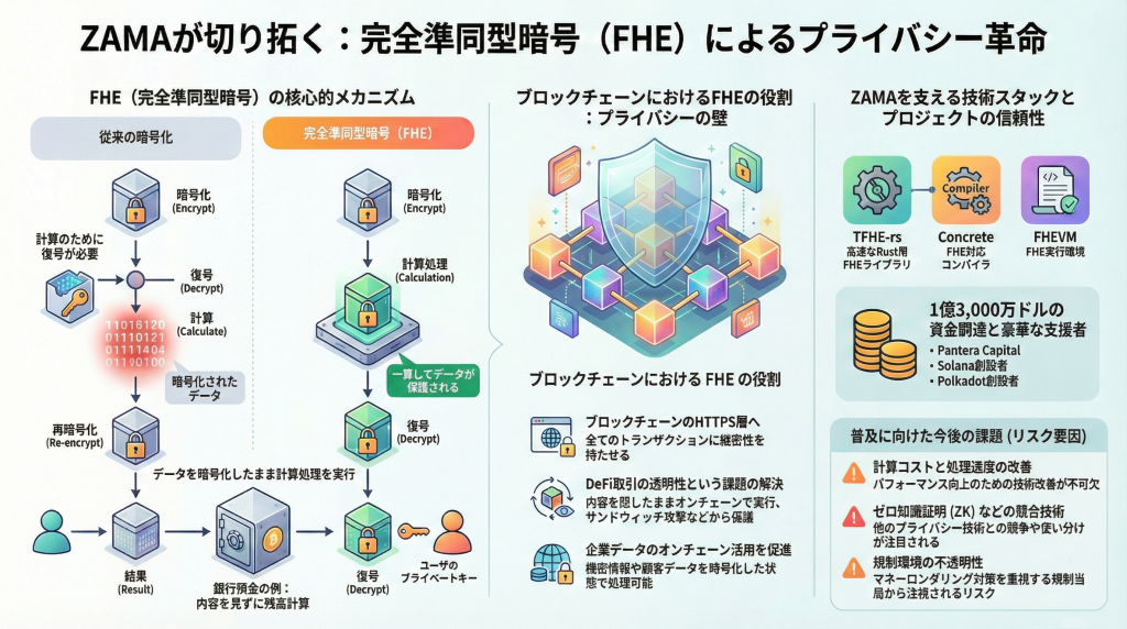 ZAMA(ザマ)は、完全準同型暗号(FHE)技術 を使い、ブロックチェーンのプライバシー問題を根本的に解決することを目指すプロジェクトです。