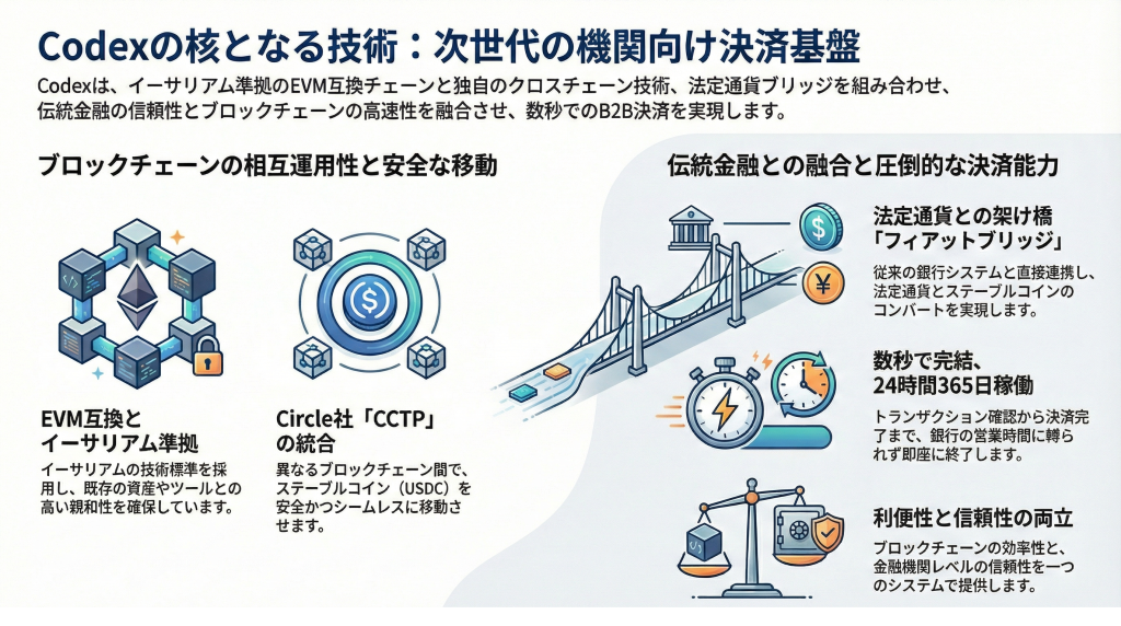 Codexはこの課題を解決するため、ステーブルコイン決済に特化した専用チェーンとして設計されています。USドルと価値が連動するUSDCを基軸に、企業間での迅速で低コストな決済を実現します。