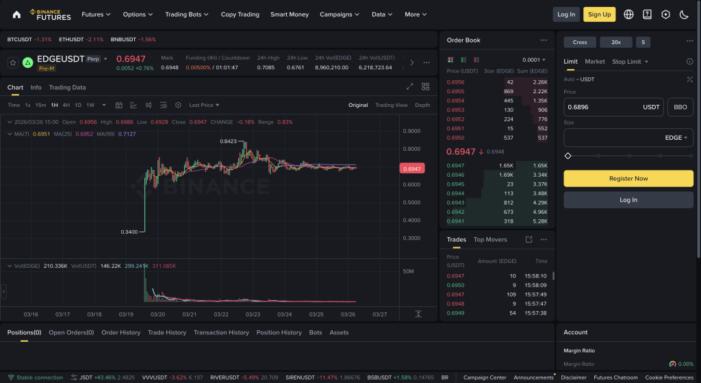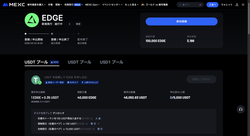 Binance Futuresの案内では、EDGEの総供給量は10億枚とされています。MEXC Launchpadでは、1 EDGE = 0.35 USDTの申込価格と、比較用として0.7 USDTの価格表示が確認できます。