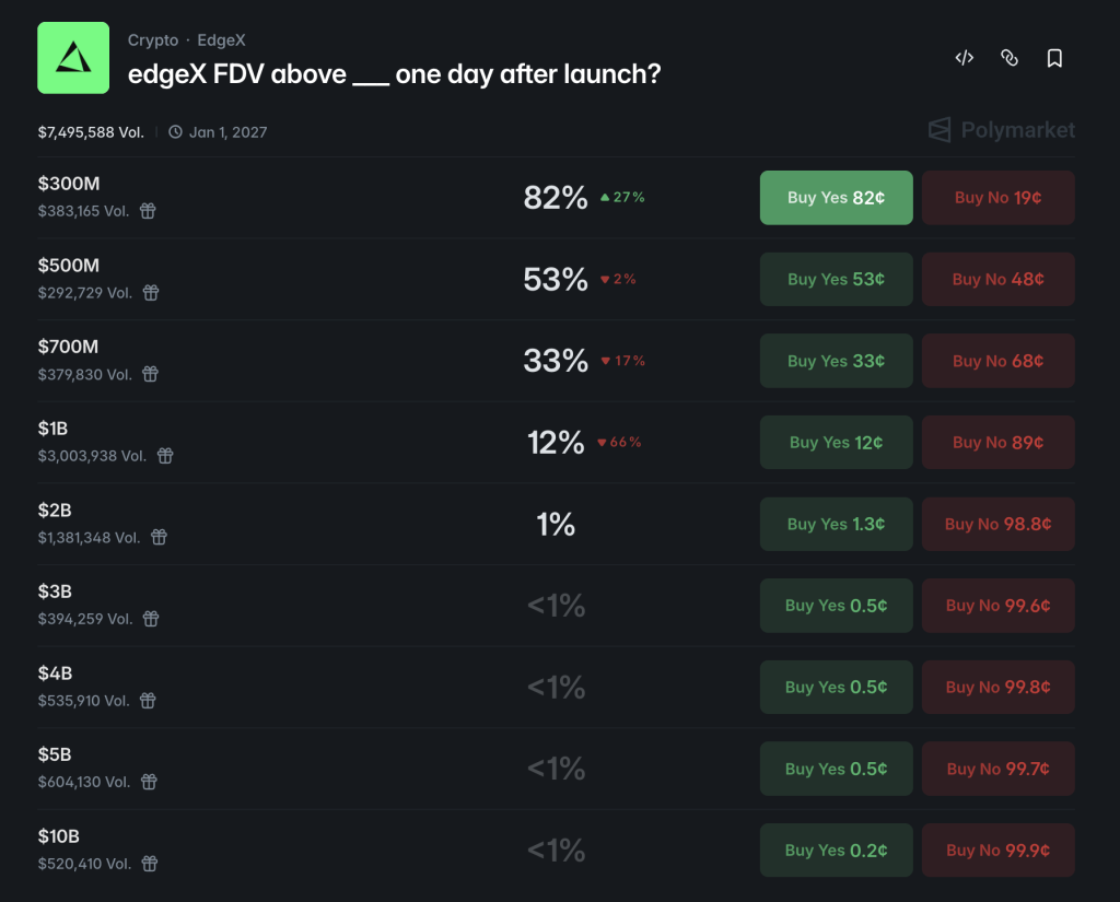 Polymarketでは、FDV3億ドル超が最も有力視され、5億ドル超も相応に意識されている一方、7億ドル超や10億ドル超はより強気なシナリオとして見られていました。